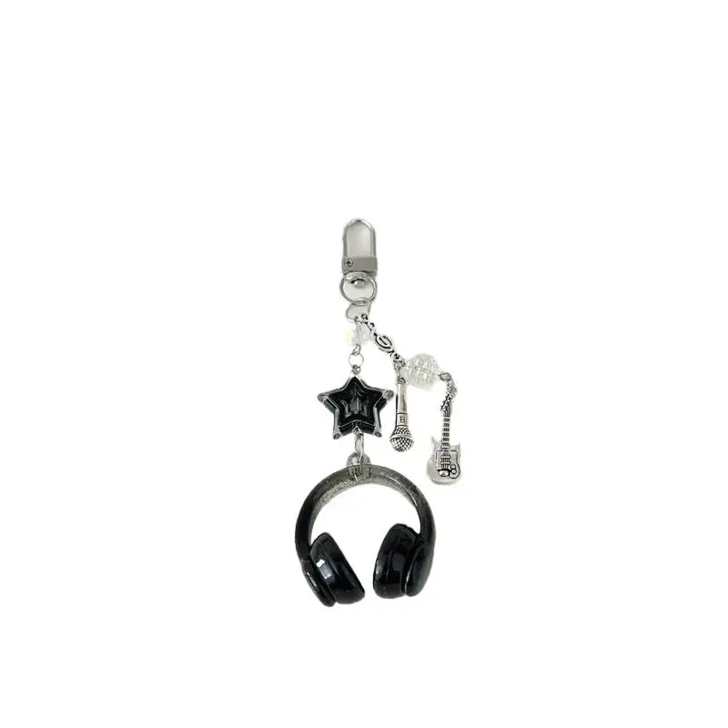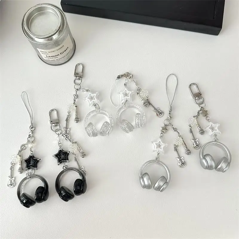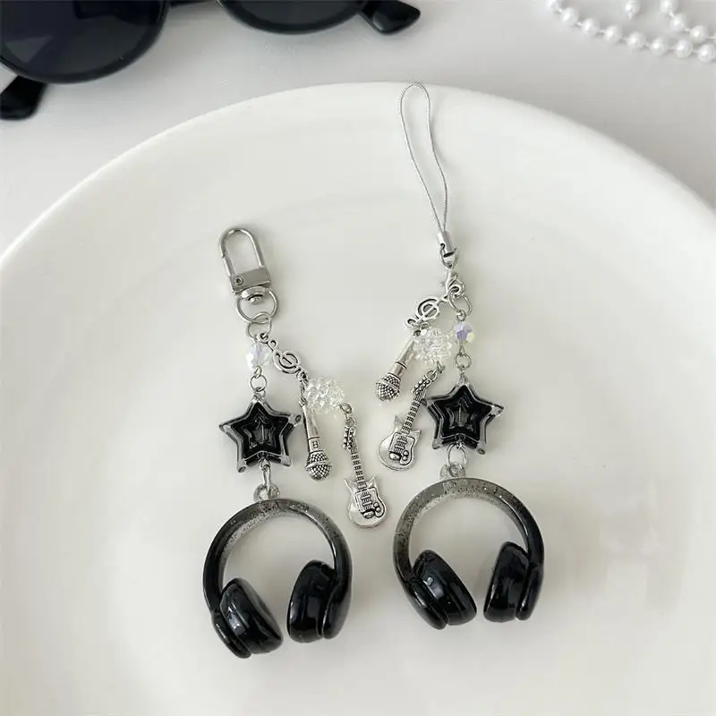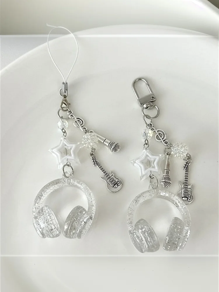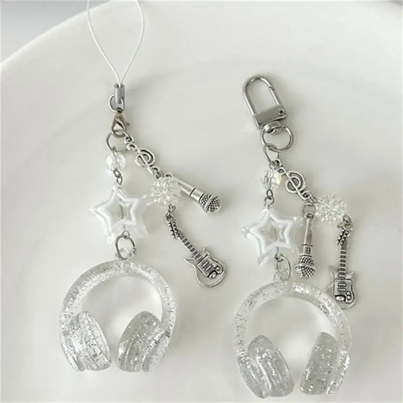 Glitter Earphone-shaped Keychain Cute Star Guitar Microphone Pendant Phone Chain Lanyard Girly Backpack Charms Bag Hanging Gifts