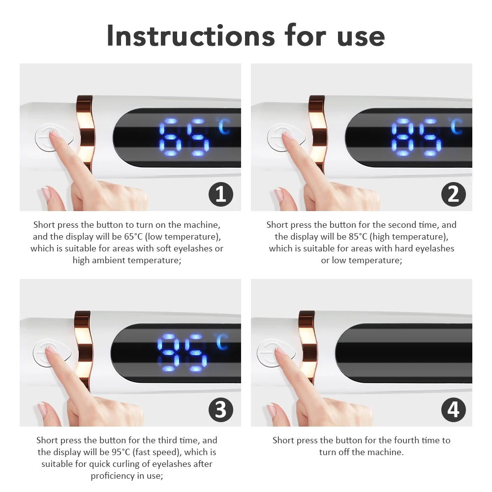 3. Our product has a constant temperature and fast heating function, supporting three-speed temperature adjustment of 65°C, 85°C and 95°C, to meet the needs of different types of eyelashes and different eye areas, and create curled eyelashes in all directions.